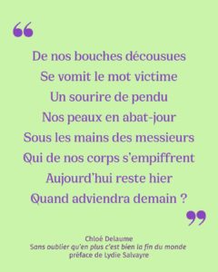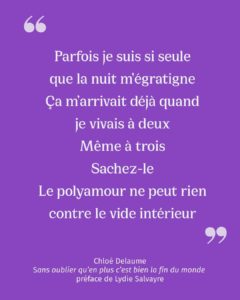 Publié aux éditions du Castor Astral, Sans oublier qu’en plus c’est bien la fin du monde est un recueil poétique en six parties, avec des entrées thématiques, des poèmes et des paroles de chansons.